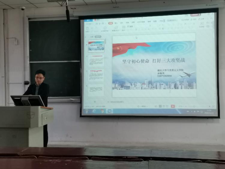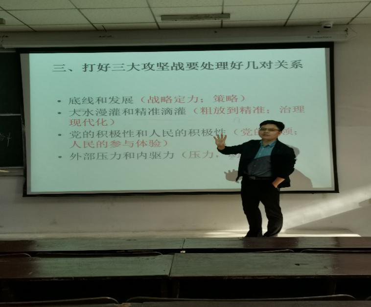 马克思主义学院副教授易振龙老师在3号教学楼210课室对马院思想政治教育17、18、19级全体学生开展了《坚守初心报告,打好三大攻坚战》的主题报告。易老师通过“重大风险”、“精准扶贫”、“污染防治”三个方面向同学们讲授三大攻坚战的深刻内容及其重大意义。