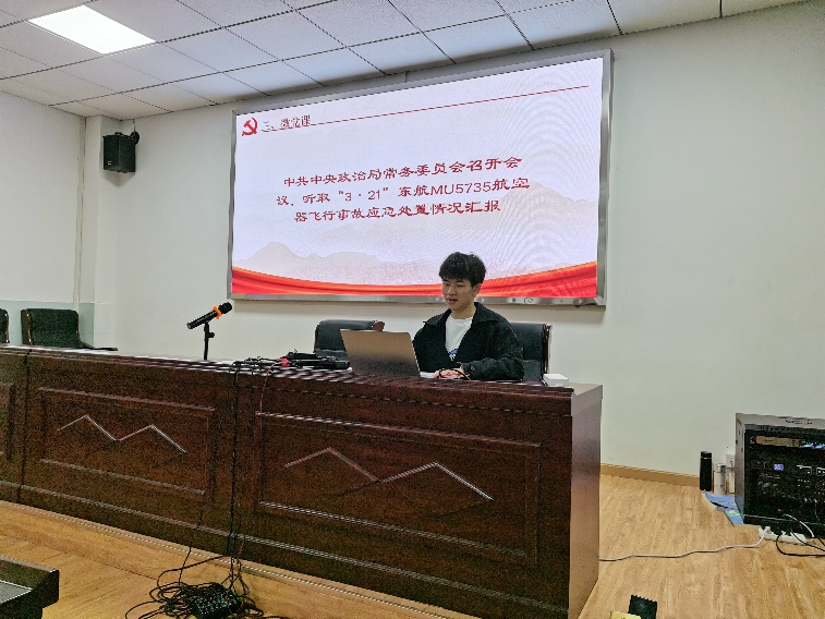 在集体重温入党誓词,诵读党章第九章第48条、49条《党组》部分后,四月份主题党日活动正式开始。肖迪涵同志对中共中央政治局常务委员会听取“3·21”东航MU5735航空器飞行事故应急处置情况汇报的会议内容要点进行了讲解,并带领大家共同学习党的十八大以来习近平总书记关于总体国家安全观、安全生产的重要论述。