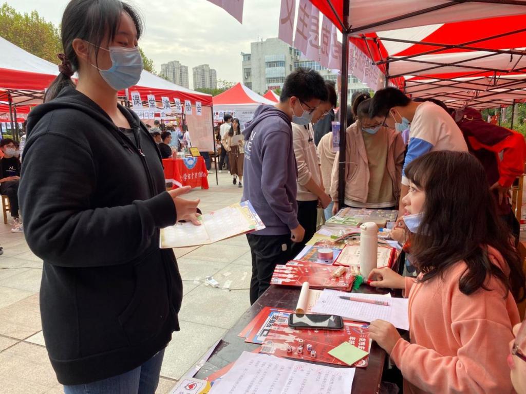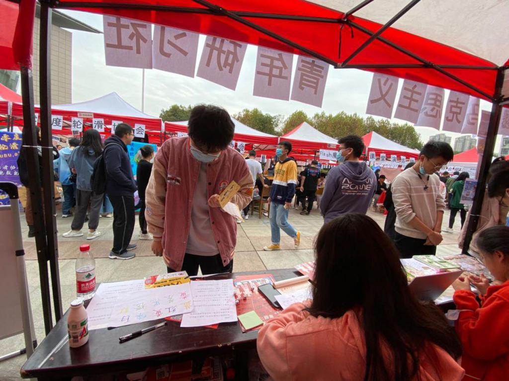 学生社团在图书馆门前求索广场开展了以“社彩纷呈,联梦琴园”为主题的百团大战招新活动。学校社团通过多种方式纳新,展现了丰富多彩的社团文化。