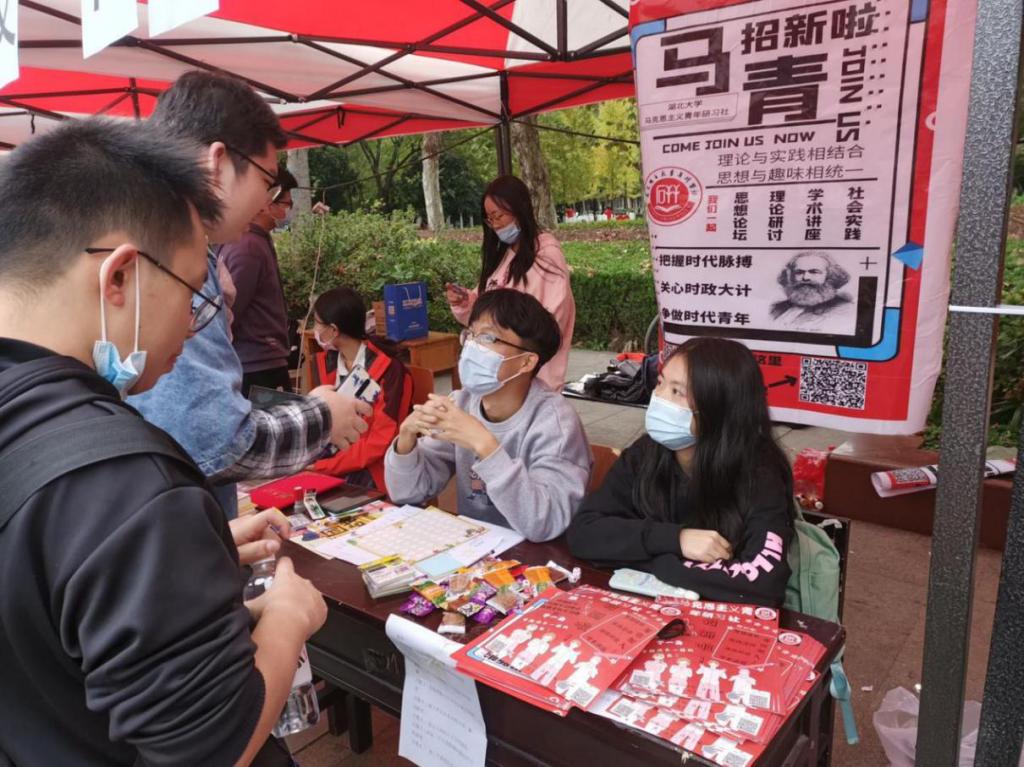 下设的马克思主义青年研习社参与了这次活动。马克思主义青年研习社于2019年12月由原马列主义学习协会,廉政文化学习协会和沙湖论坛合并而成,在继承原先三个社团的宗旨、原则和精神、理念的基础上,进行有机整合,实现新历史条件下的创新发展。在本次活动中,马克思主义青年研习社紧跟时代主题,关注时政,通过游戏问答的方式,从疫情思考,当下目标和未来展望等几个方面出发,落实马青“把握时代脉搏、关心时政大计、争做时代青年”的口号,吸引了诸多有志青年的加入。