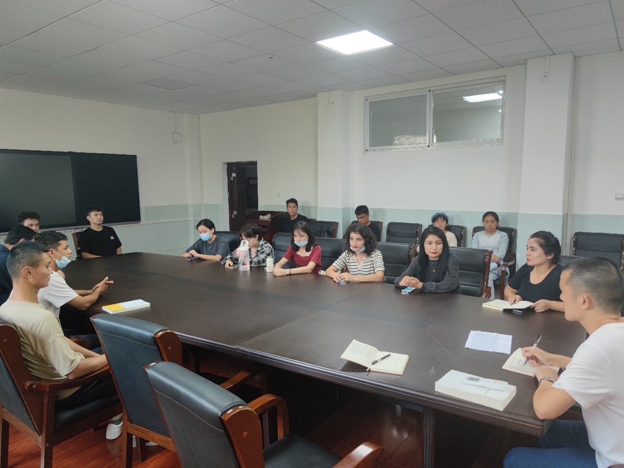 在四楼会议室召开10月份新疆籍少数民族学生工作例会。学院党委副书记晏妮、学院团委书记邹浩、新疆籍少数民族辅导员美娅莎以及全体新疆籍少数民族学生参加例会。会议由院团委书记邹浩主持。