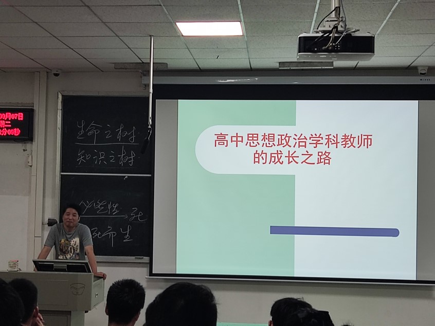 副教授郭劲松在教三402教室,为本院2018级本科生讲授优秀教师成长专题的第一课:政教专业学生的中学教师成长之路。本次讲座由学院政教系副主任胡银银主持。