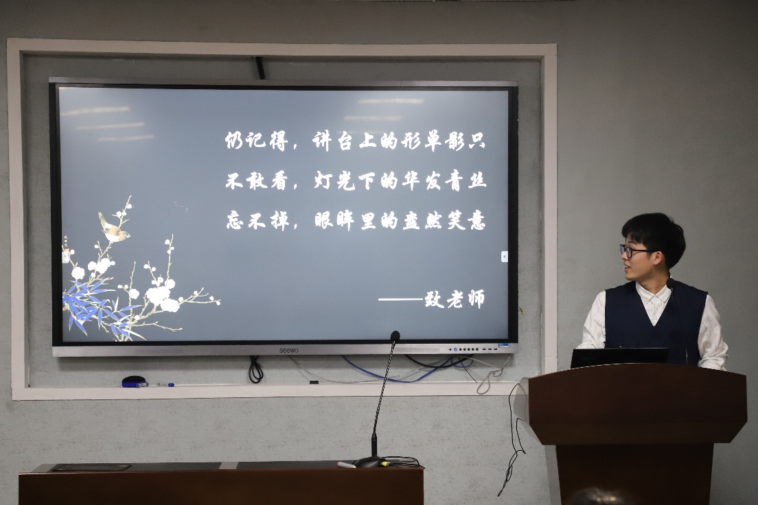王晓凤的作品围绕建党100周年进行创作,表达了自己对党的热爱与祝愿;“二十八宿笑靥皆如你,坠落我心红楼与梦里,化作良辰花解语的诗句”,历史文化学院冯仲鑫的作品词句优美,深入人心;“我携赤道一起,将白天与黑夜一个拿来见你,一个拿来想你不偏不倚”,资源与环境学院刘少林的作品运用地理学相关知识表达了我所拥有的时间里都有你的存在的浪漫情感;“I can think of the three most romantic things in the world ,the whale falling into the sea;the moon embedded in the Milky Way;and waking up every morning to see you around me”,外国语学院李凯帆用鲸落、星月、陪伴描绘了他所理解的三重浪漫;“仍记得,讲台上的形单影只;不敢看,灯光下的华发青丝;忘不掉,眼眸里的盎然笑意”,文学院蒋志强把浓浓的情意赋在这三行文字里,流露出对老师深深的爱与感激。