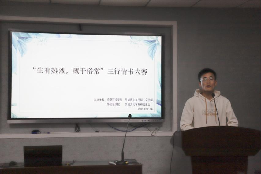 、资源环境学院、文学院、外国语学院、历史文化学院研究生会联合举办的“生有热烈,藏与俗常”三行情书比赛在文学院B6016会议室成功开展,五院研究生会和部分同学参加了此次活动。