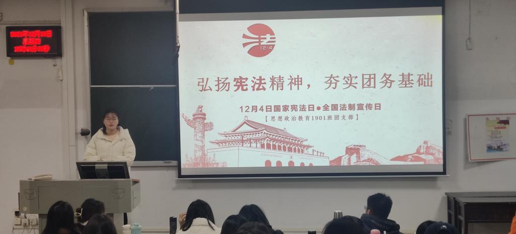 12月16日,为进一步推动班级团员结合学习贯彻党的十九届六中全会精神合党史学习教育内容,加强法治观念,强化法治意识,增强法制自信,学院1901班团支部在教3-402教室召开以“弘扬宪法精神,夯实团务基础”为主题的主题团日活动,从而推动同学们筑牢底线意识。本次主题团日活动由1901班团支书周慧同学主持。