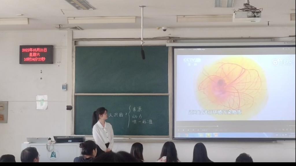 21级学科思政研究生王琴的授课内容是高中政治必修四《哲学与文化》中的“哲学意义上价值的特征”。她采用案例教学法,通过讨论疫情期间大家所准备的各种防疫物品,引出哲学意义上价值的内涵和特征,引导学生应不断充实自己,全面发展,最终实现人的真正价值。
