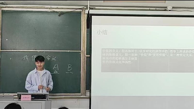 21级学科思政研究生韩鑫轲的授课内容是高中政治必修四《哲学与文化》中的“哲学意义上价值的含义”。他采用情境教学法,由两个模拟情境引出哲学意义上价值的内涵,通过对价值内涵的深入讲解,使学生提高价值理解力、价值判断力、价值鉴别力,最终引导学生树立正确的价值观。
