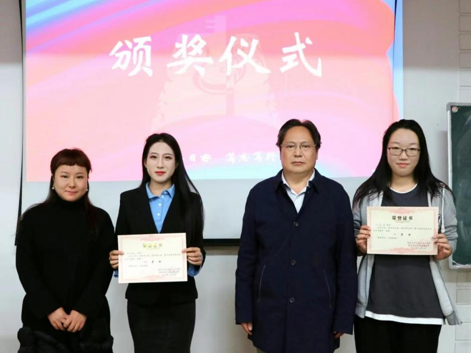 卢国琪老师,新闻传播学院罗宜虹老师为获得一等奖的选手颁奖)