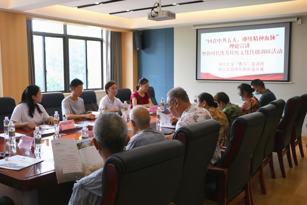 “青马”宣讲团6位成员赴中华路街道都府堤社区交流座谈。中华路街道办党建办公室科长李洁,户部巷、楚才、西城壕、都府堤四个社区相关负责人、“红巷爷爷”代表、都府堤社区居民代表、西瓜视频