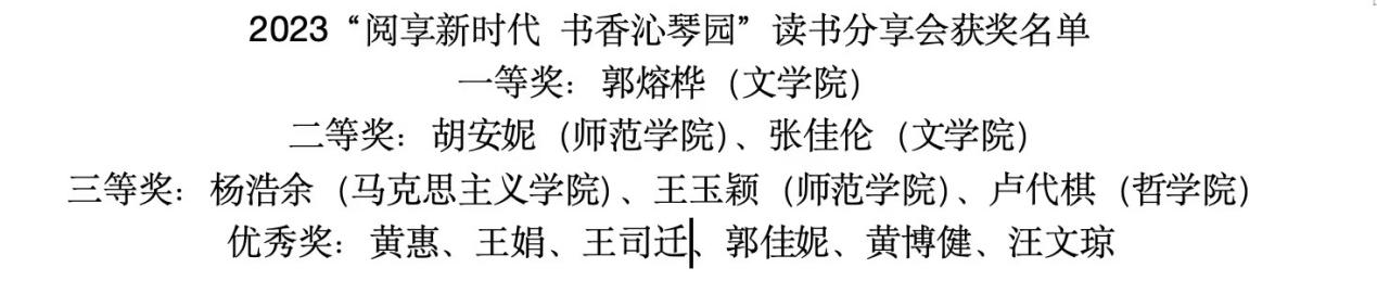 最后,经过现场评委老师的专业评审,郭熔烨同学获一等奖,胡安妮等2名同学获二等奖,杨浩余等3名同学获三等奖,黄惠等6名同学获优秀奖。本次读书分享会既开阔了同学们的视野,又培养了“爱读书、善读书、好读书”的良好氛围,有力推进了学校“书香校园”建设。