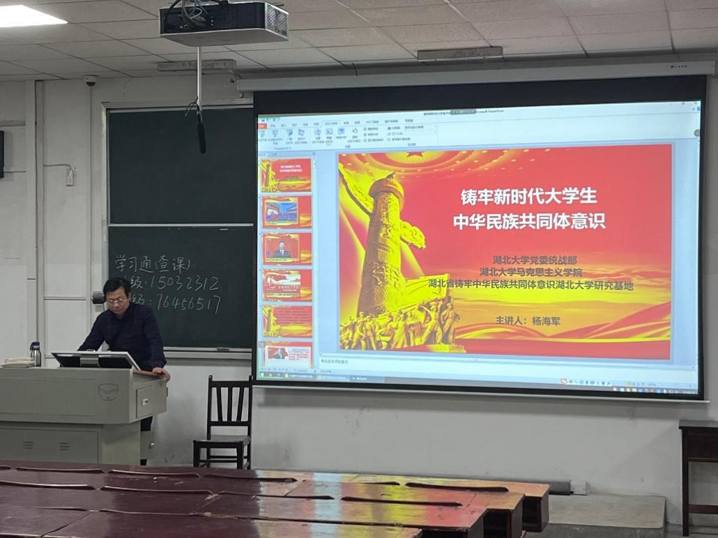 杨海军老师以习近平总书记在党的二十大报告中的重要讲话为切入点,从中华民族共同体意识的提出及内涵、中华民族的民族团结及伟大成就、铸牢中华民族共同体意识的行动指南、高校要将“铸牢中华民族共同体意识”贯穿立德树人全过程、铸牢新时代大学生中华民族共同体意识五个方面展开讲授。
