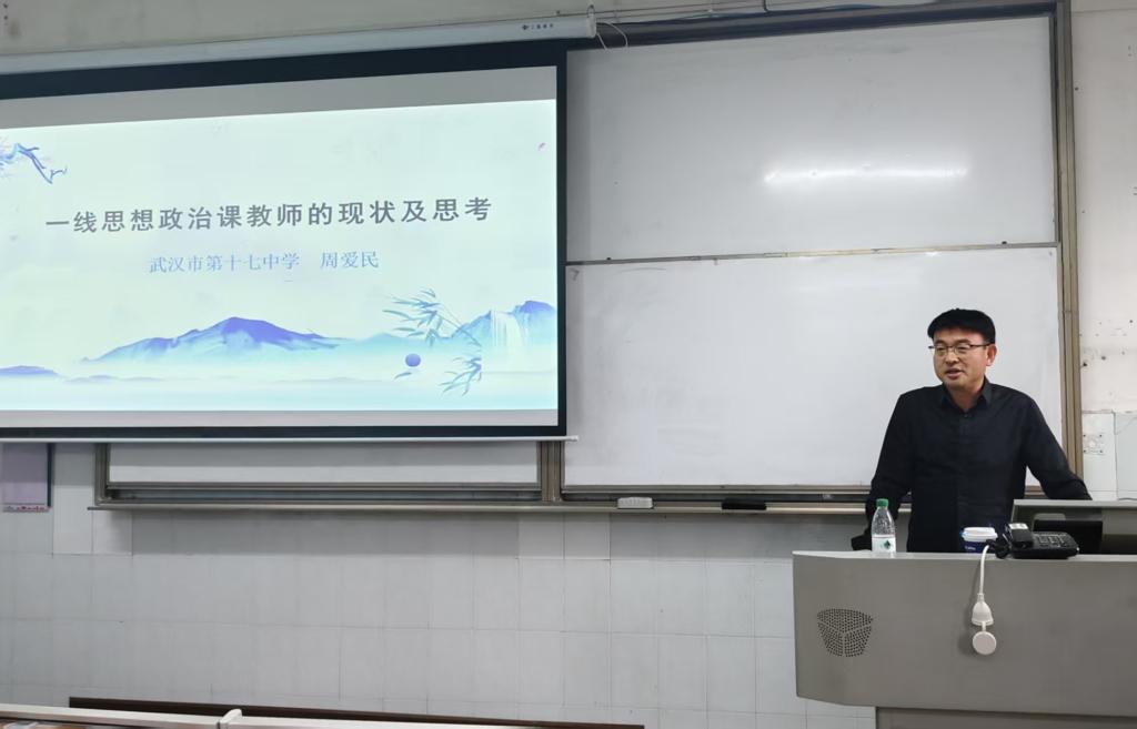 特邀请武汉第十七中资深教师周爱民,开展以“一线思想政治课教师的现状及思考”为主题的专题讲座。本次讲座由胡银银老师主持,2023级全体思政教育专业学生到场聆听。