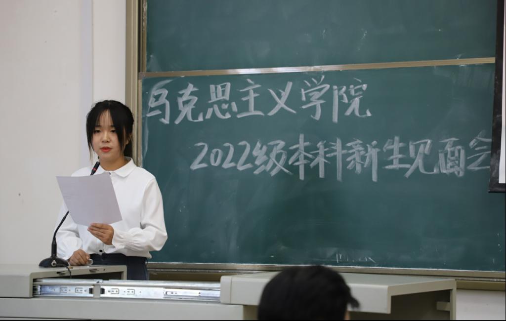 22级思想政治教育专业本科生马若涵代表新生代表发言。“青春不以山海为远,志愿只向家国未来。”她分享了加入马院大家庭的喜悦与成为马院人的责任。在座新生纷纷表示将认真传承“马院一家人”的优良传统,刻苦学习,提升专业素养,肩负时代责任,不负青春韶华,早日成为堪当民族复兴大任的时代新人。