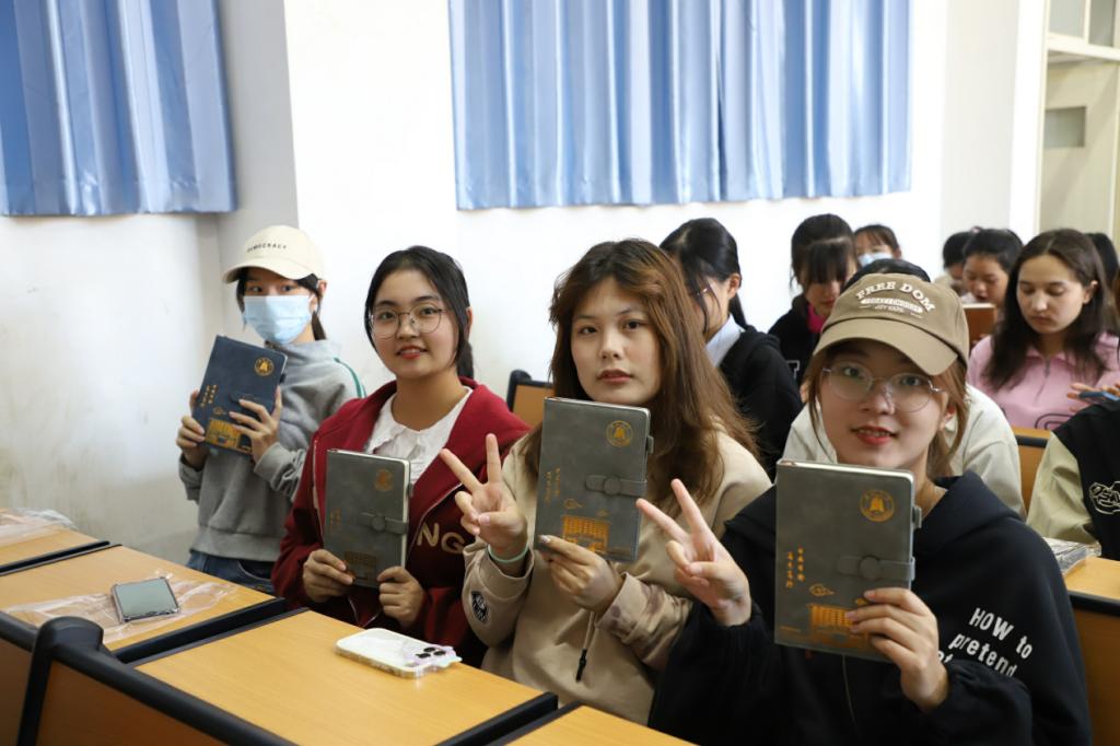 (图为2022级思想政治教育专业新生收到定制笔记本并一起合影)