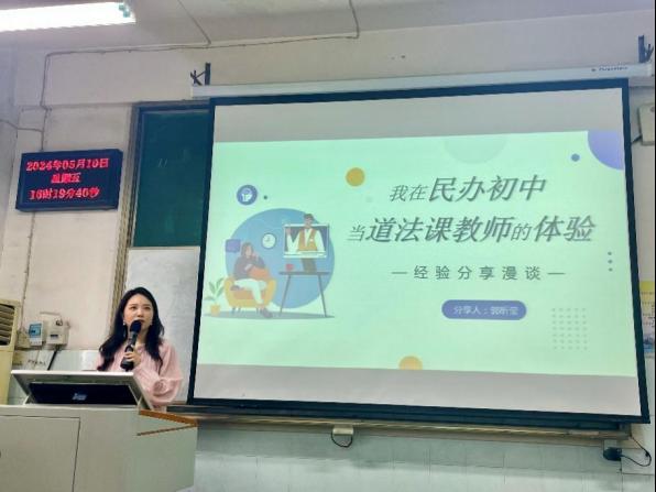 5月10日下午,郭昕莹同学以“我在民办初中当道法课教师的体验”为题,为同学们分享了自己就业时的所思所想,以及在民办初中教学的真实体验与感受。郭昕莹希望同学们在未来择业时要视野放宽,心态放平,相信“是金子一定会发光”。
